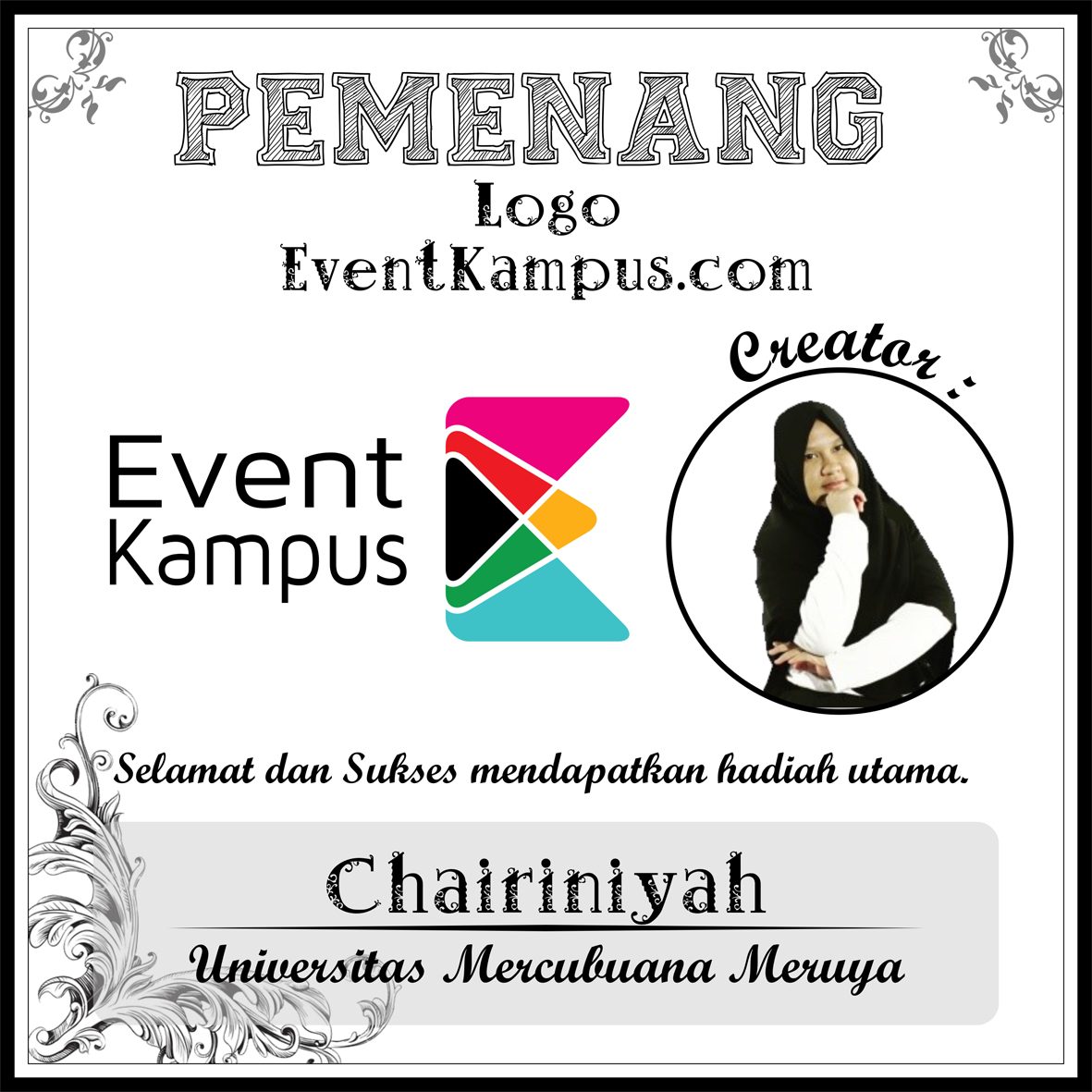 Selamat & Sukses kepada saudari Chairiniyah dari UNIVERSITAS MERCUBUANA JAKARTA atas keberhasilannya dalam memenangkan lomba logo tingkat nasional yang diadakan oleh EVENTKAMPUS.COM, semoga atas kemenangan ini bisa menambah semangat dan kreativitas bagi mahasiswa lainnya yang juga telah mengikuti lomba logo yang telah kita laksanakan.