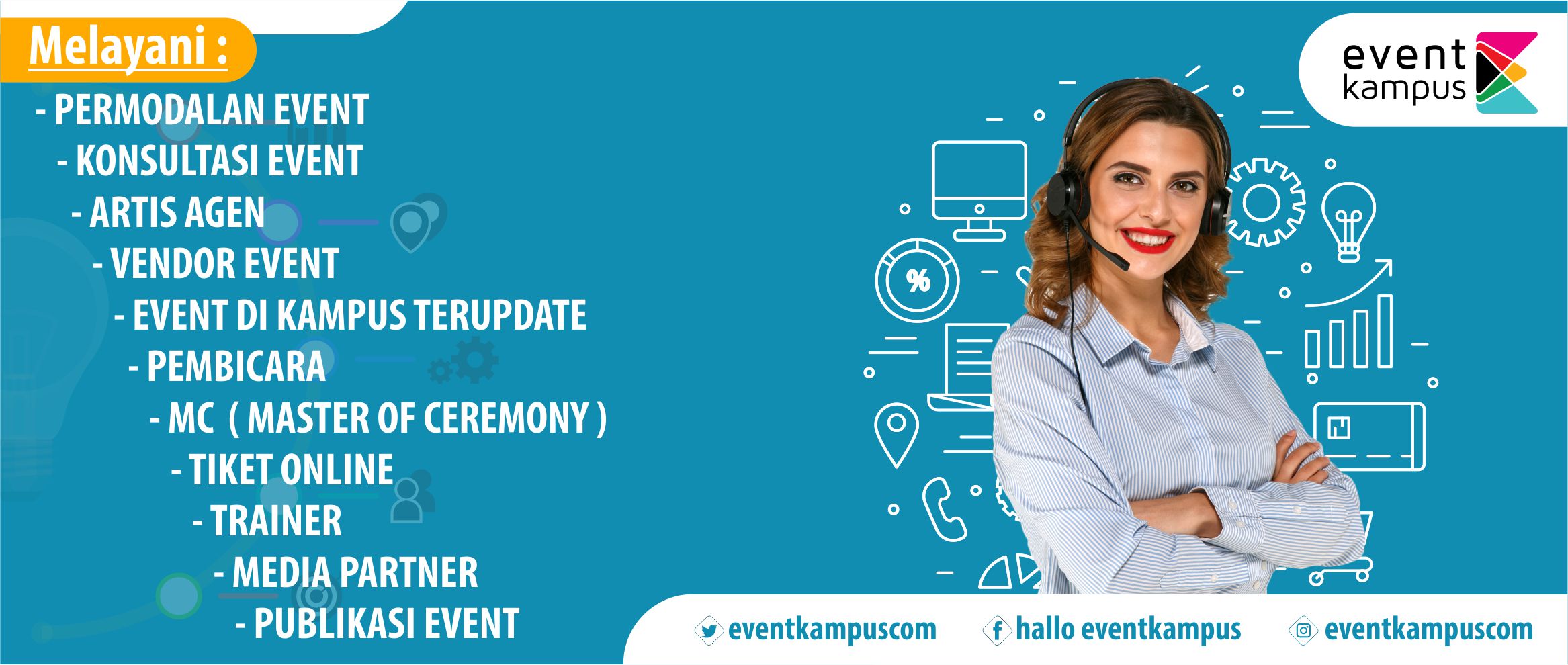 Dengan tujuan memberikan kemudahan bagi penyelenggara acara (terutama mahasiswa/i). EventKampus.com dapat bertindak sebagai konsultan acara atas persetujuan dan permintaan panitia, memberikan pendampingan kepada panitia acara dalam persiapan sampai pelaksanaan.