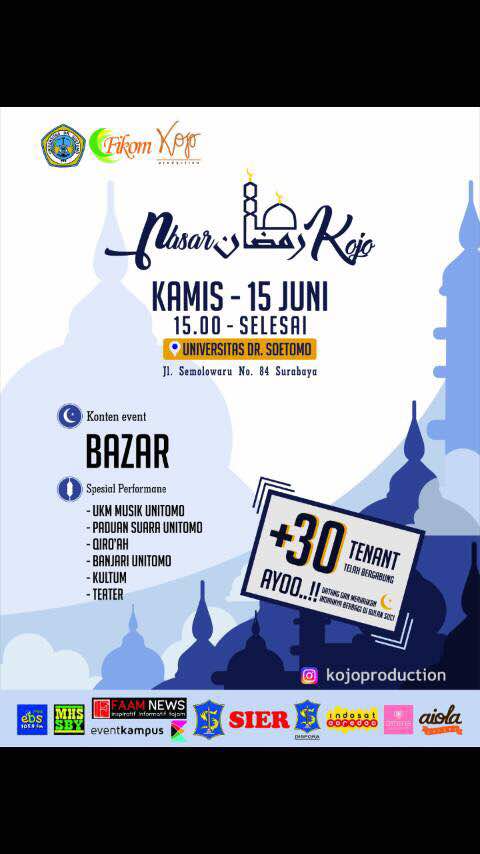 Sebagai pelengkapnya acara ini ada Bazar dengan 30 tenant dan hiburan dari teman teman Unit Kegiatan Mahasiswa UNITOMO. Ada penampilan, Qiro’ah, Kultum, Banjari, Teater, dan Musik Religi. Diadakan pada tanggal 15 Juni 2017 hari KAMIS bertempat di Lapangan Universitas Dr. Soetomo mulai buka jam 3sore hingga berakhir. Pembukaan acara oleh Rektor Univ. Dr. Soetomo Surabaya, Bp. Bahrul Amiq.