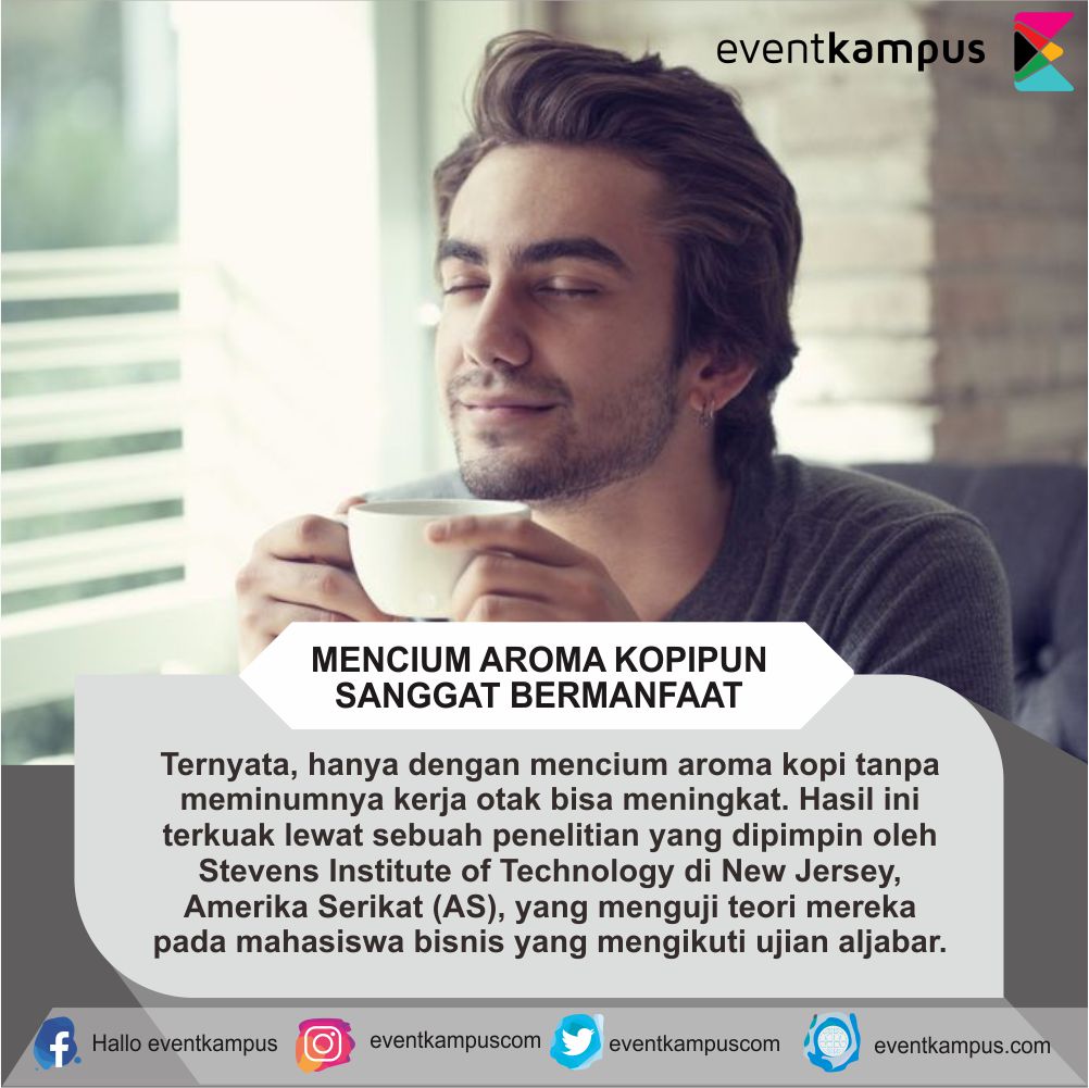 Ternyata, hanya dengan mencium aroma kopi tanpa meminumnya kerja otak bisa meningkat. Hasil ini terkuak lewat sebuah penelitian yang dipimpin oleh Stevens Institute of Technology di New Jersey, Amerika Serikat (AS), yang menguji teori mereka pada mahasiswa bisnis yang mengikuti ujian aljabar.
