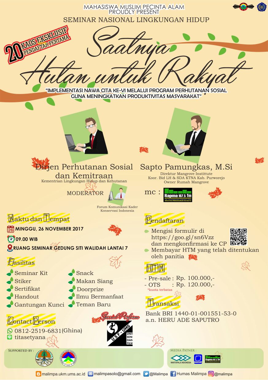 Seminar nasional lingkungan hidup ini merupakan event kedua setelah 4 tahun lalu tepatnya di tahun 2013, seminar kali ini mengusung tema “Saatnya Hutan untuk Rakyat” yang akan membahas tentang Implementasi Nawa Cita ke-VI melalui Program Perhutanan Sosial guna Meningkatkan Produktivitas Masyarakat, akan dilaksanakan pada hari Minggu, 26 November 2017 yang bertempat di Ruang Seminar Gedung Induk Siti Walidah lantai 7 Universitas Muhammadiyah Surakarta (UMS) dengan pembicara dari Kementrian Lingkungan Hidup dan Kehutanan serta Aktifis Lingkungan Hidup Bapak Sapto Pamungkas, M. Si yang merupakan pencetus Hutan Mangrove, Semarang.