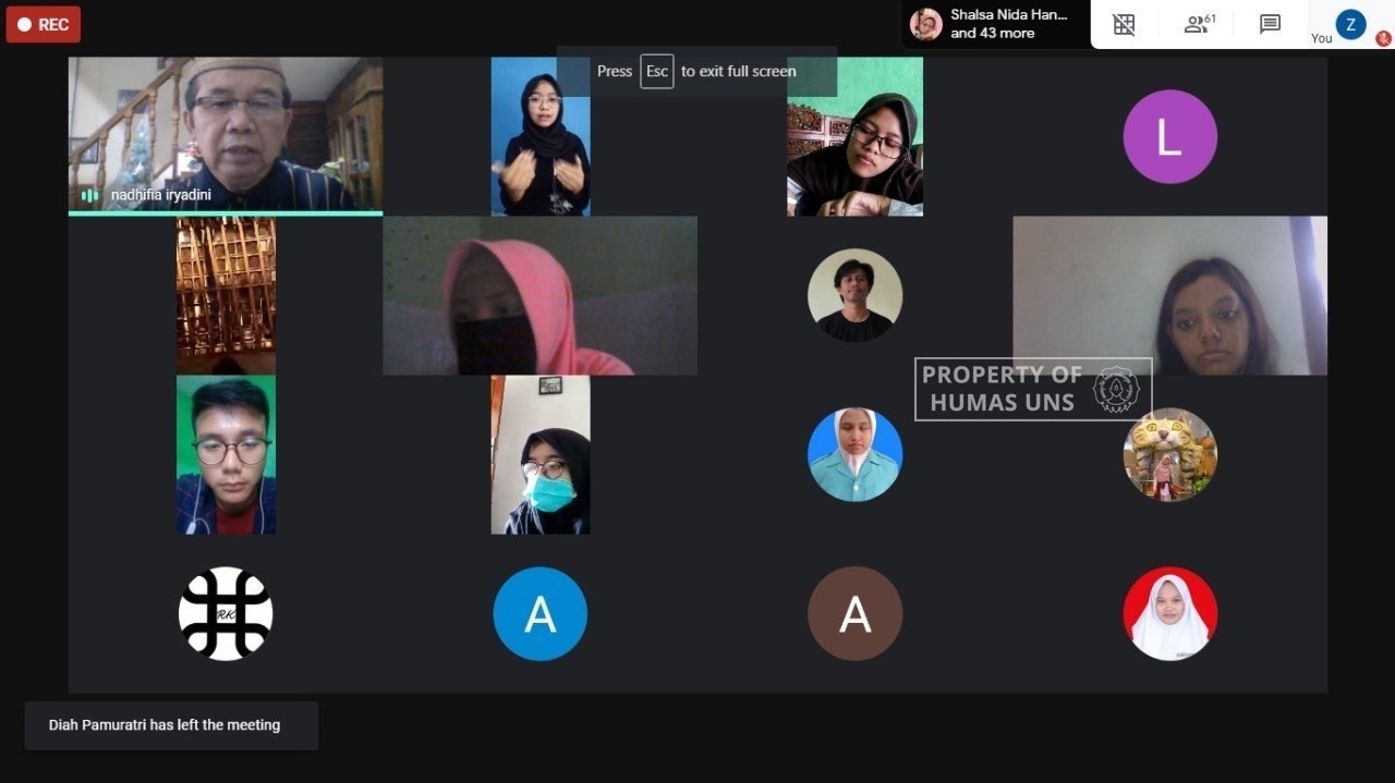 UNS – Badan Eksekutif Mahasiswa (BEM) Universitas Sebelas Maret (UNS) Surakarta menggelar diskusi daring dengan tema “Mewujudkan UNS Ramah Difabel” pada Sabtu (29/8/2020) melalui aplikasi Google Meet. Acara ini menghadikan Prof. Dr. Munawir Yusuf, M.Psi selaku Dosen Pendidikan Luar Biasa (PLB) UNS sekaligus Ketua Pusat Studi Disabilitas (PSD) UNS sebagai narusumber utama.