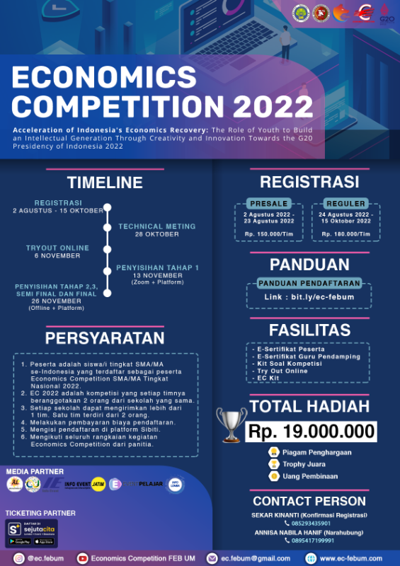Economics Competition merupakan suatu kompetisi terbesar dan tertua di bidang ilmu ekonomi bagi siswa-siswi SMA dan sederajat di seluruh Indonesia. Acara ini diselenggarakan oleh Himpunan Mahasiswa Jurusan Ekonomi Pembangunan Fakultas Ekonomi Universitas Negeri Malang (HMD EKP FEB-UM). HMD EKP secara konsisten mengadakan program kerja tahunan ini sejak tahun 2002 hingga sekarang sebagai bentuk dedikasi kami untuk memberikan wadah kepada seluruh siswa-siswi di Indonesia untuk menggali potensi, wawasan keilmuan dalam memecahkan berbagai masalah ekonomi. Melalui momentum Indonesia yang menjadi tuan rumah penyelenggara forum G20 saat ini Economics Competition membawa konsep baru dengan tema “Acceleration of Indonesia's Economics Recovery: The Role of Youth to Build an Intellectual Generation Through Creativity and Innovation Towards the G20 Presidency of Indonesia 2022”. Kompetisi EC terdiri dari lima tahapan yaitu: Penyisihan Tahap I, Penyisihan Tahap II, Penyisihan Tahap III, Tahap Semifinal dan Tahap Final. Selain itu, kami membawakan game digital untuk melengkapi keseruan dalam kompetisi EC 2022.
