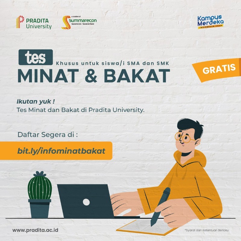 Kamu bisa mengikuti test minat bakat Pradita University secara GRATIS supaya kamu gak salah jurusan loh! Lewat tes ini kamu bisa tau pilihan jurusan maupun bidang studi yang lebih cocok untuk kamu. Tidak hanya minat dan bakat, Pradita University juga menyediakan test ini secara lengkap, mulai dari tes kepribadian, minat, gaya belajar dan nilai personal. Selain itu, tes ini juga bisa mengukur kemampuan diri kamu baik kemampuan kognitif, penalaran induktif dan deduktif, angka, visualisasi, kecepatan dan ketelitian serta pemahaman diri.