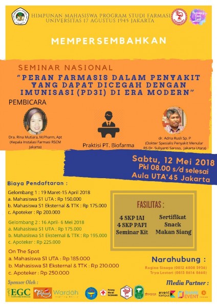 Acara seminar nasional ini merupakan salah satu acara yang diselenggarakan oleh fakultas farmasi universitas 17 Agustus 1945 Jakarta, sebagai perayaan dalam menyambut hari kesehatan dunia. Acara tersebut bertempat di aula UTA'45 jakarta pada hari sabtu 12 Mei 2018, dengan pembicara dari praktisi PT. Biofarma, dokter spesialis penyakit menular RS. Sulianti Saroso, dan kepala instalasi farmasi RSCM. Acara tersebut memiliki tema yaitu "peran farmasi dalam pencegahan penyakit dengan imunisasi di era modern". Acara tersebut akan dibagi menjadi 2 sesi dan pembagian sertifikat akan diberikan pada sesi terakhir. Acara tersebut memiliki SKP sebanyak 8 SKP.