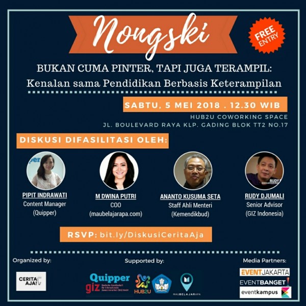 Kalau kalian punya pendapat soal pendidikan Indonesia dan cara meningkatkan kualitas pendidikan di Indonesia, kami mengundang teman-teman sekalian ke event diskusi Hari Pendidikan yang diselenggarakan oleh Cerita Aja di Hub2U Coworking Space, hari Sabtu tanggal 5 Mei 2018 bersama dengan Perwakilan Kemendikbud, GIZ Indonesia, Quipper Indonesia, dan maubelajarapa.com. Sila mendaftarkan diri di http://bit.ly/DiskusiCeritaAja. Kami tunggu cerita kamu. #PinterTerampil