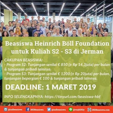 Heinrich Böll Foundation membuka Beasiswa S2 dan S3 di Jerman untuk pelamar non-EU (non-Uni Eropa), termasuk dari Indonesia. Beasiswa yang diberikan berupa tunjangan sebesar € 850 (± Rp 14,3juta) per bulan serta sejumlah tunjangan pribadi bagi penerima beasiswa S2.