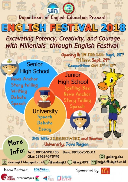 π Assalamua'laikum wr. wbπ ππHELLO GUYS! ππ π©π»π«π¬π§ *Students' Association of Department of English Education UIN Syarif Hidayatullah Jakarta* π¬π§π©π»π« Proudly presents: π£ β *ENGLISH FESTIVAL 2018* π£β ππͺπ _*Excavating Potency, Creativity, and Courage with Millenials Through English Festival*_ πͺπ π