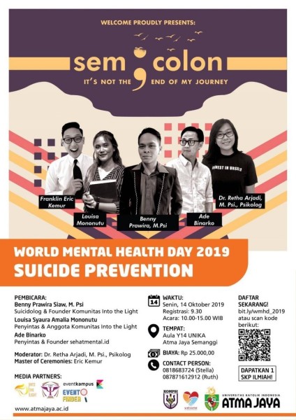 Untuk meningkatkan kesadaran akan kesehatan mental, kami dari komunitas WELCOME ingin mengajak kalian dalam rangka memperingati WMHD dengan berpartisipasi dalam seminar bertopik suicide prevention "SEMICOLON: it's not the end of my journey"