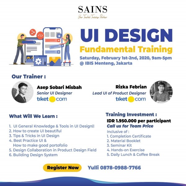UI Designers juga harus menguasai berbagai UI Design Tools, supaya dapat fine-tune skillsnya dan menghasilkan design yang lebih bagus lagi. Jika rekan-rekan berminat untuk mempelajari UI Design, program training kita ini sangatlah cocok karena akan membantu teman-teman dalam mastering dasar-dasar dalam UI Design sekaligus langsung exercise praktiknya. Jika teman-teman sudah memiliki dasar pemahaman yang kuat tentang UI Design Foundations, maka teman-teman juga bisa menyelam lebih dalam lagi.