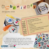 Pada workshop ini, peserta akan diajarkan menyulam diatas kain dengan jarum jahit, benang, dan woodening. Karya yang dihasilkan dapat berupa hiasan dengan berbagai bentuk seperti bunga, daun, dan lain-lain.