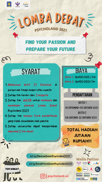 Hai teman-teman! Gimana kabarnya? Ada kabar baik nih, akhirnya kita akan launching Lomba perdana dari Psycholand yaitu Debat Nasional Psycholand 2021! 📣